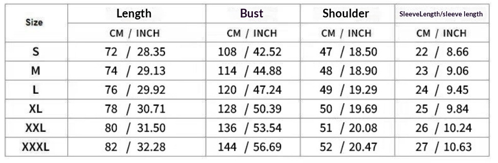 Sizes: S, M, L, XL, XXL, XXXL